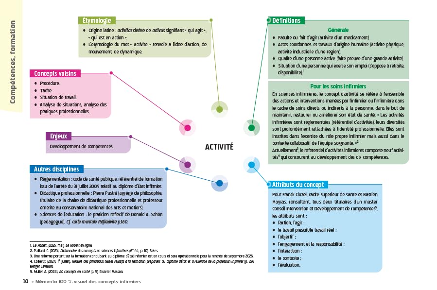 Synthétiques et didactiques, les cartes mentales sont organisées en 6 rubriques récurrentes pour aider à la mémorisation : étymologie, définitions (générale et pour les soins infirmiers), attributs du concept, autres disciplines, enjeux pour l’infirmier et concepts voisins.”